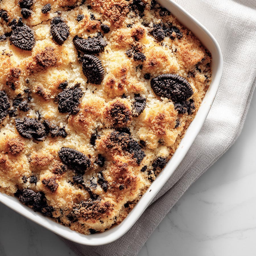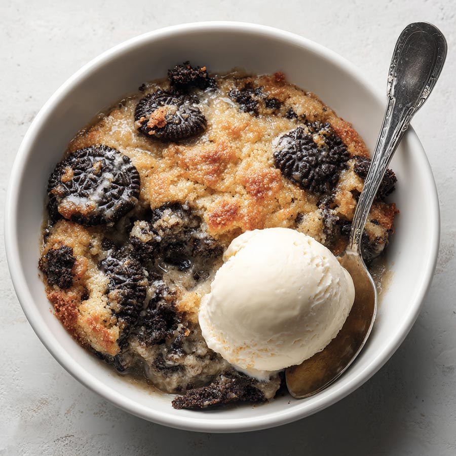 3 step Oreo cobbler baked until golden with a soft center and melted cookie pockets. Simple and comforting dessert.