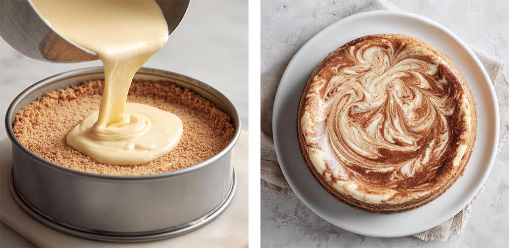 - Pour the filling into the crust. Spoon apple butter over the top and swirl gently with a knife.