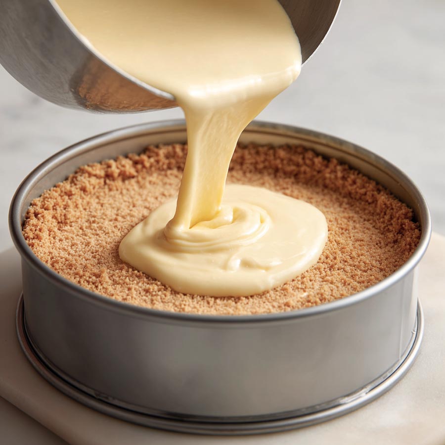 - Mix graham cracker crumbs, sugar, and melted butter. Press into the bottom of the pan and bake for 10 minutes.