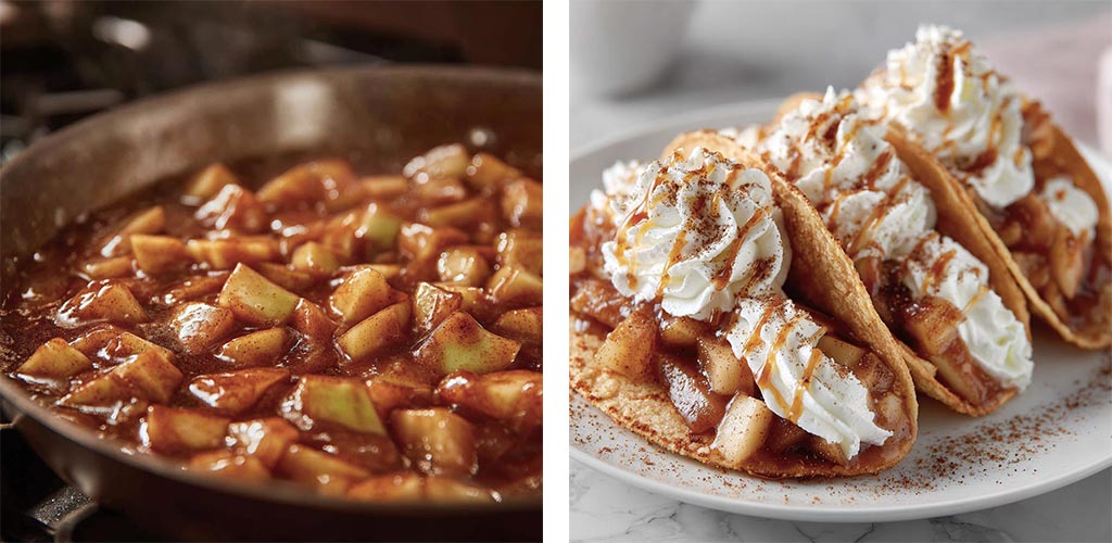 - Spoon apple filling into each taco shell. Drizzle with caramel sauce.