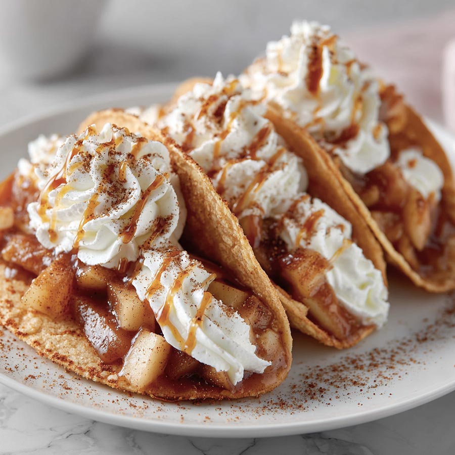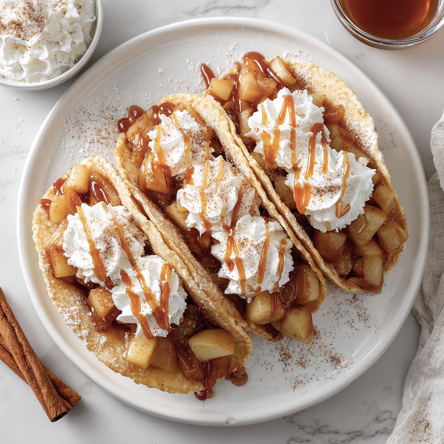 Crispy cinnamon sugar taco shells filled with warm apple pie filling, caramel drizzle, and whipped cream. A fun twist on a classic dessert.