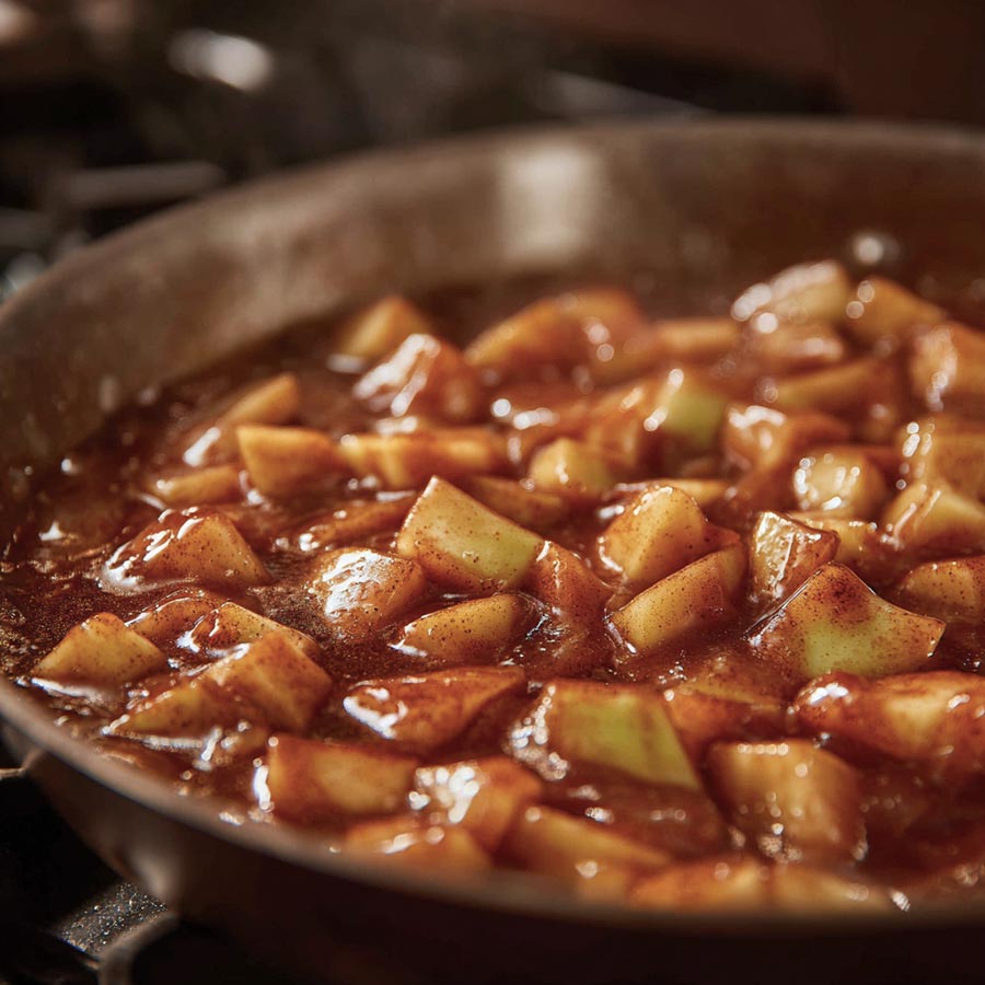 - In a skillet, melt butter and add diced apples, brown sugar, granulated sugar, and cinnamon. Cook until apples are soft, about 8 minutes.