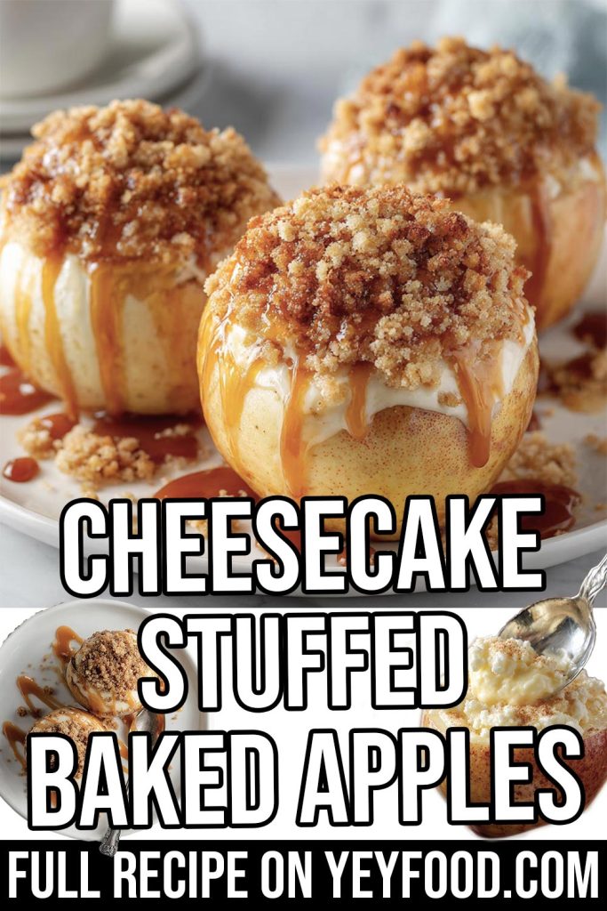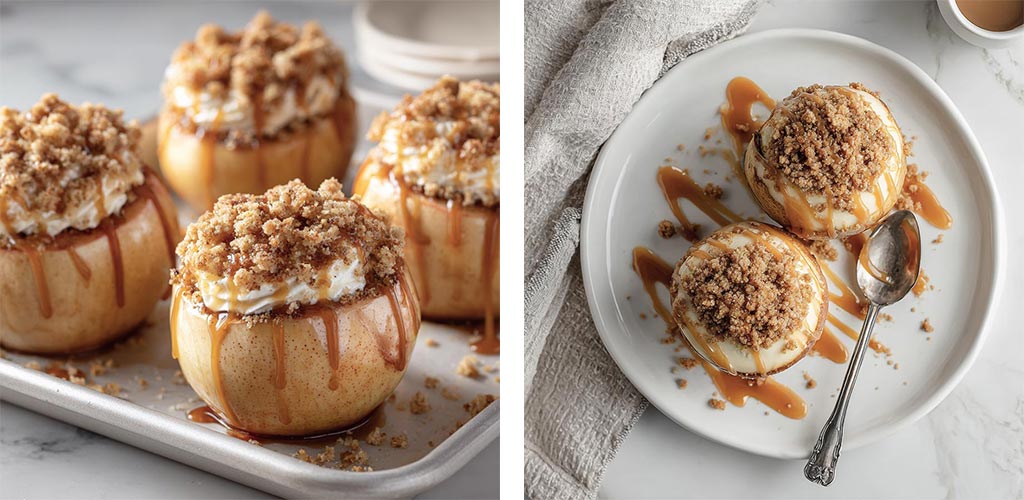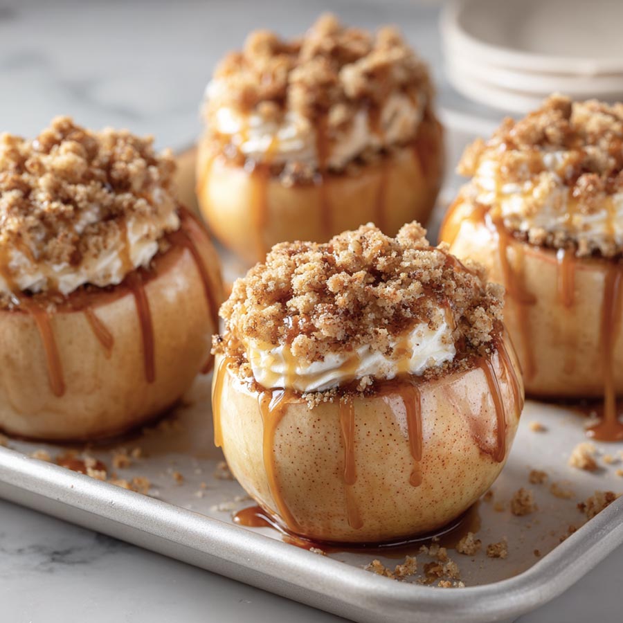 Tender baked apples filled with creamy cheesecake, topped with crunchy crumbs, and finished with caramel sauce. A cozy dessert perfect for fall.