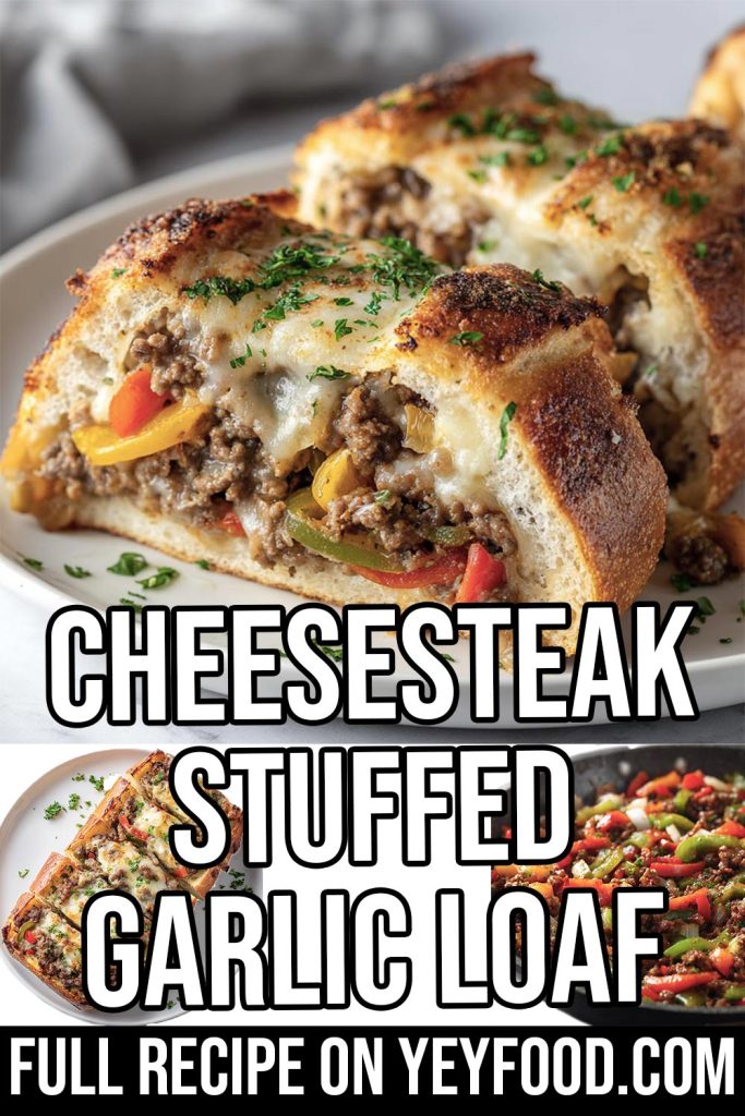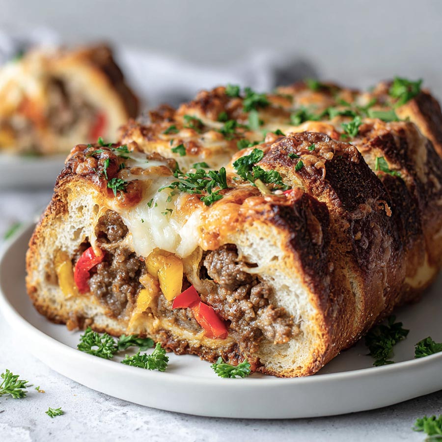 Cheesesteak stuffed garlic loaf filled with seasoned beef, peppers, and melted cheese.