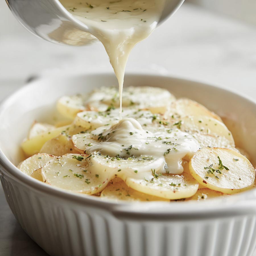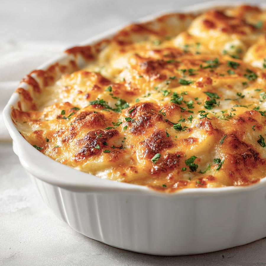 Tender layers of sliced potatoes baked in a creamy cheese sauce that forms a golden crust on top. A simple and reliable side dish for family meals.