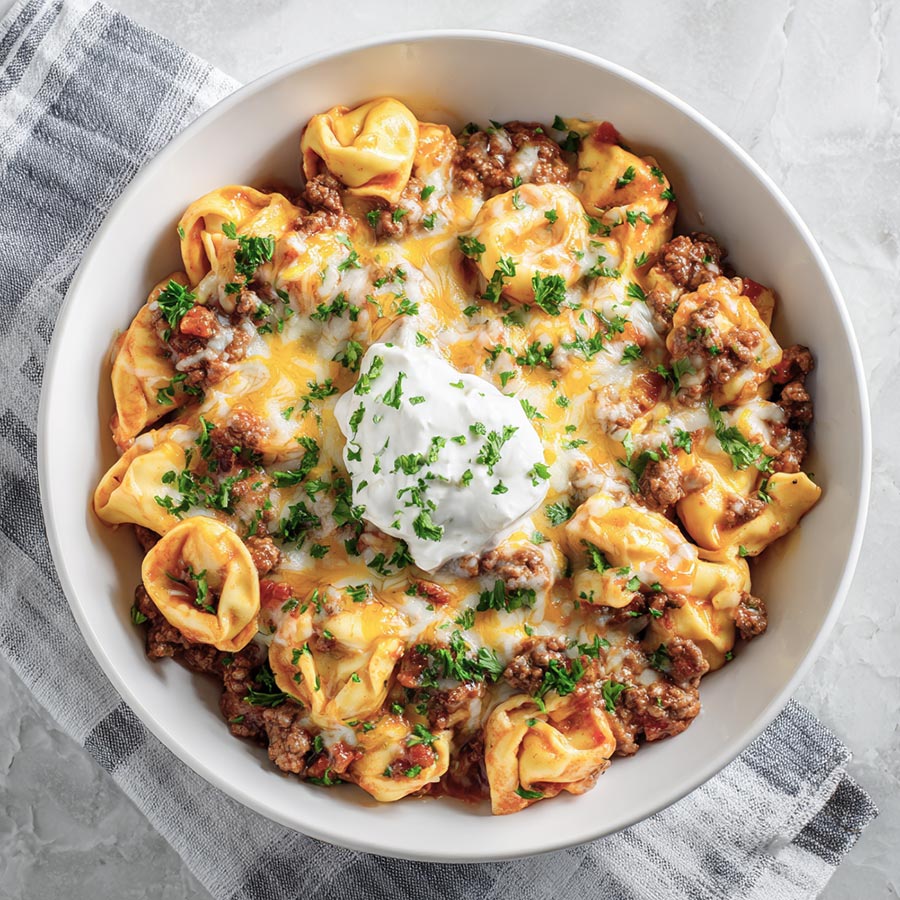 Tender cheese tortellini in a creamy taco inspired sauce with ground beef, melted cheese and warm spices. A simple comfort meal that comes together quickly and brings full flavor to the table.