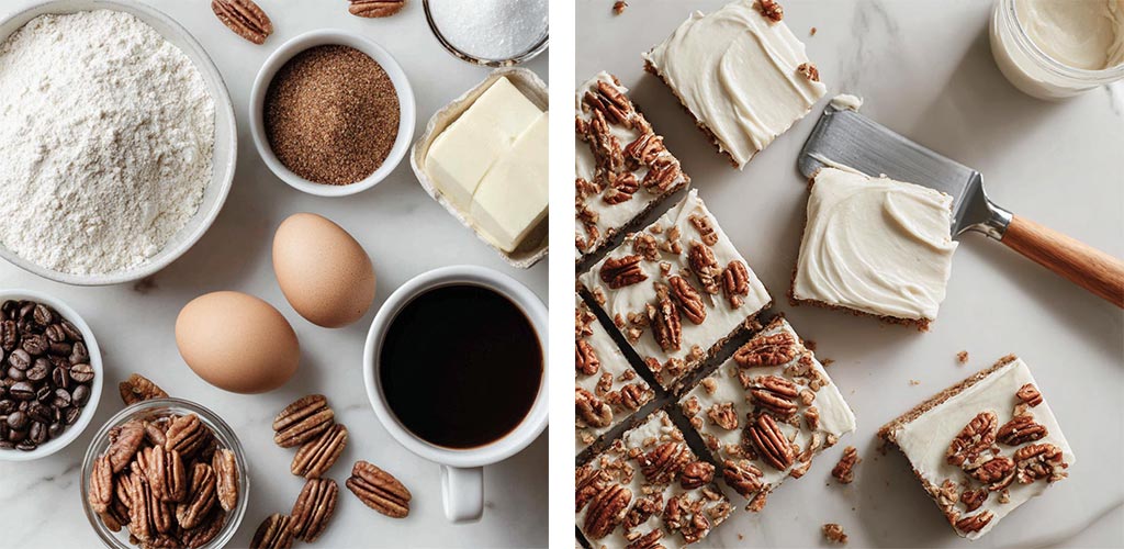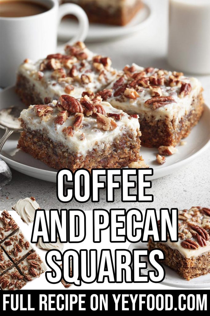 Moist coffee and pecan squares topped with smooth coffee frosting and crunchy pecans. Easy to bake and perfect for gatherings or coffee breaks.