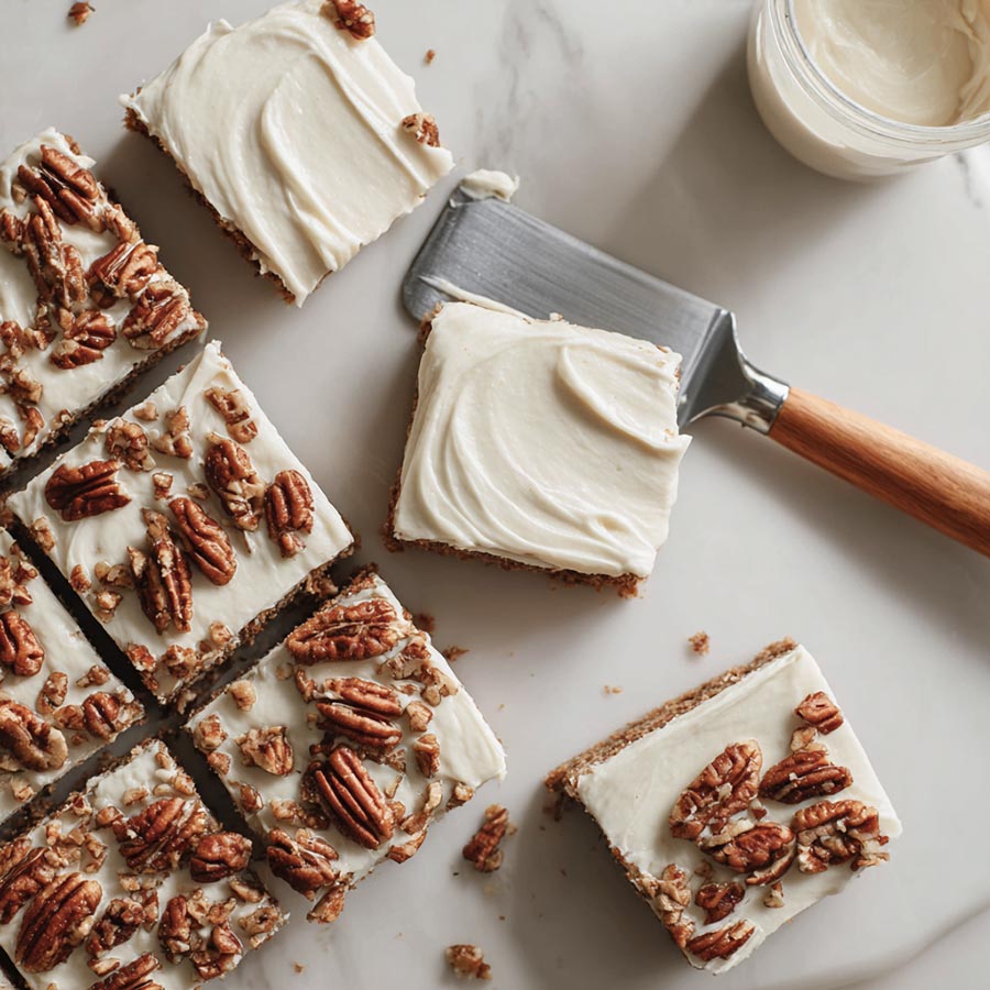 - Spread frosting over cooled squares and sprinkle with pecans. Cut into squares to serve.