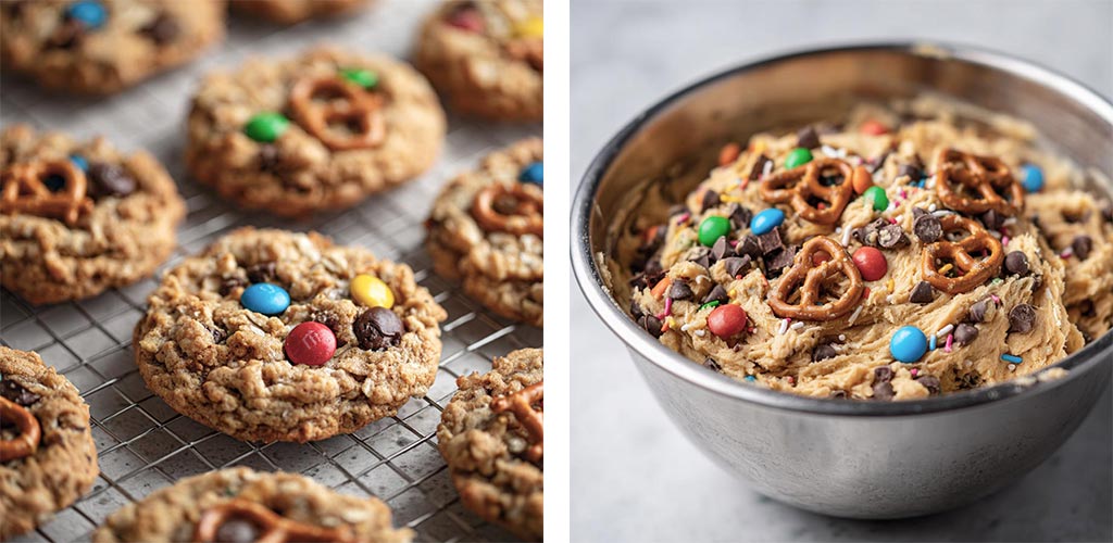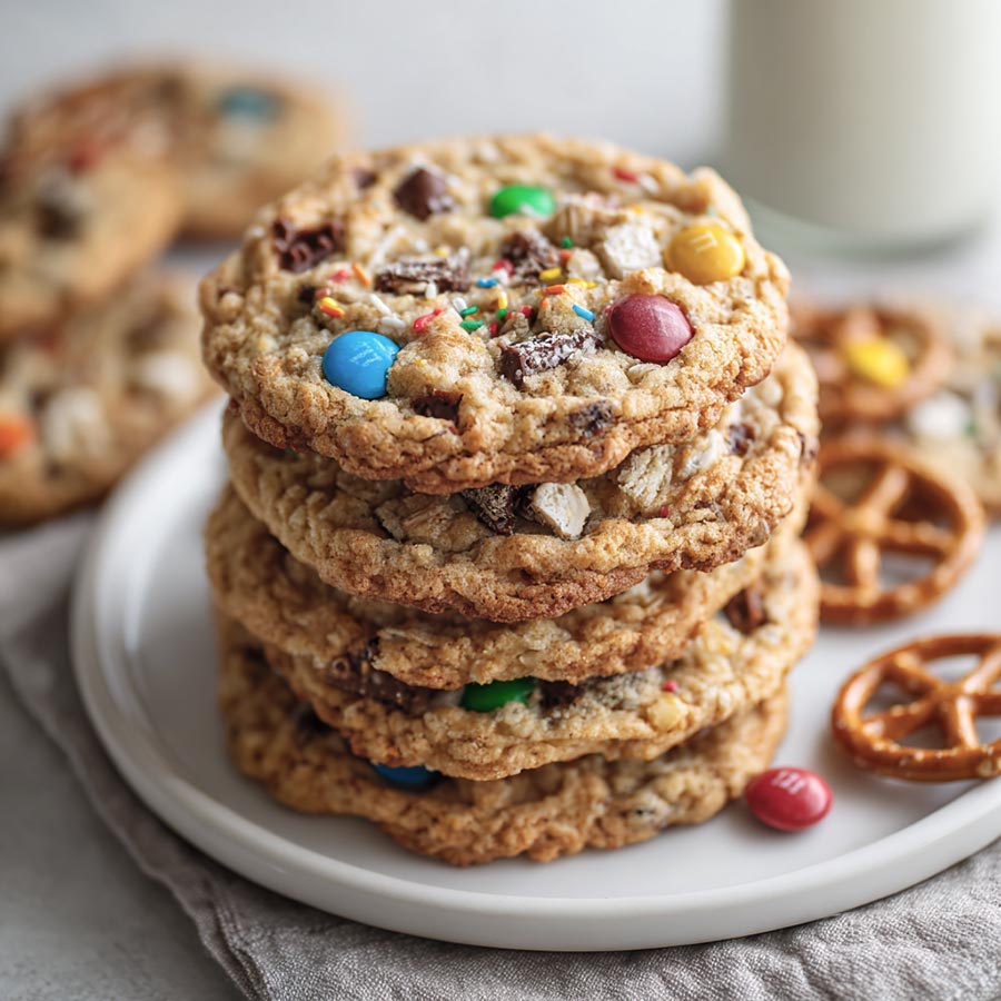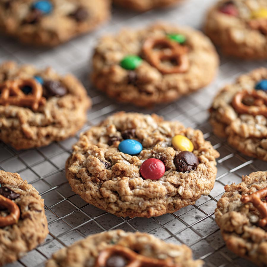 Chewy, crunchy, salty, and sweet cookies packed with oats, chocolate, pretzels, nuts, and candy. A fun treat that makes everyone happy.