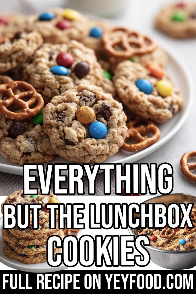 Bake a batch of Everything But The Lunchbox Cookies filled with pretzels, oats, chocolate chips, and candies. The perfect chewy, sweet, and salty cookie for any occasion.