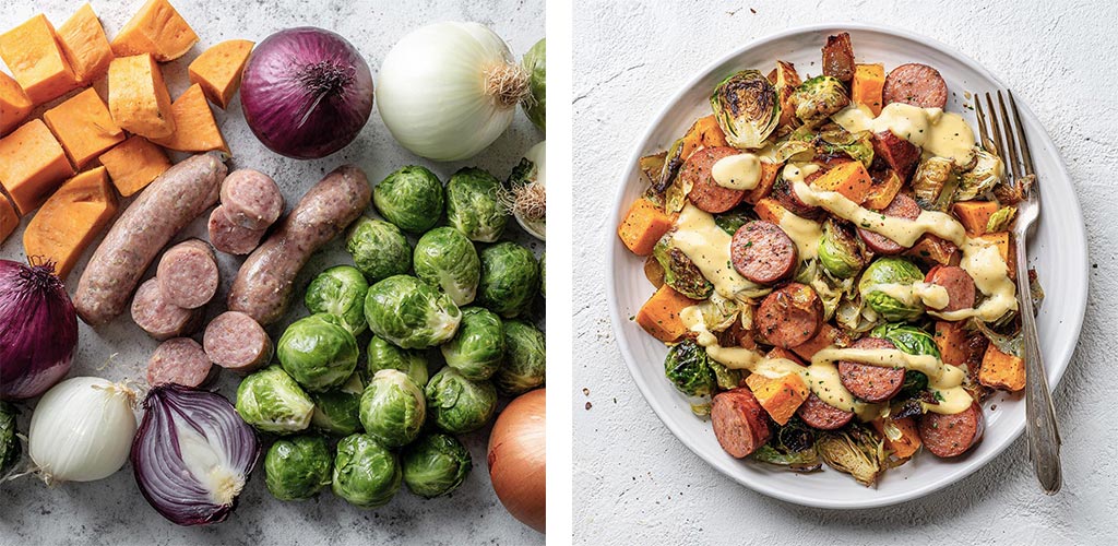 How to Make Fall Kielbasa Sheet Pan Bake With Creamy Curry Dijon Sauce
