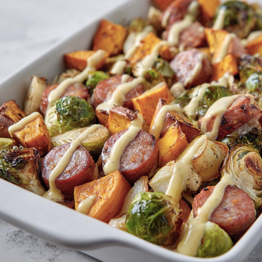 A hearty one-pan dinner of roasted vegetables and smoky kielbasa served with a creamy curry Dijon sauce. A perfect meal for fall nights.