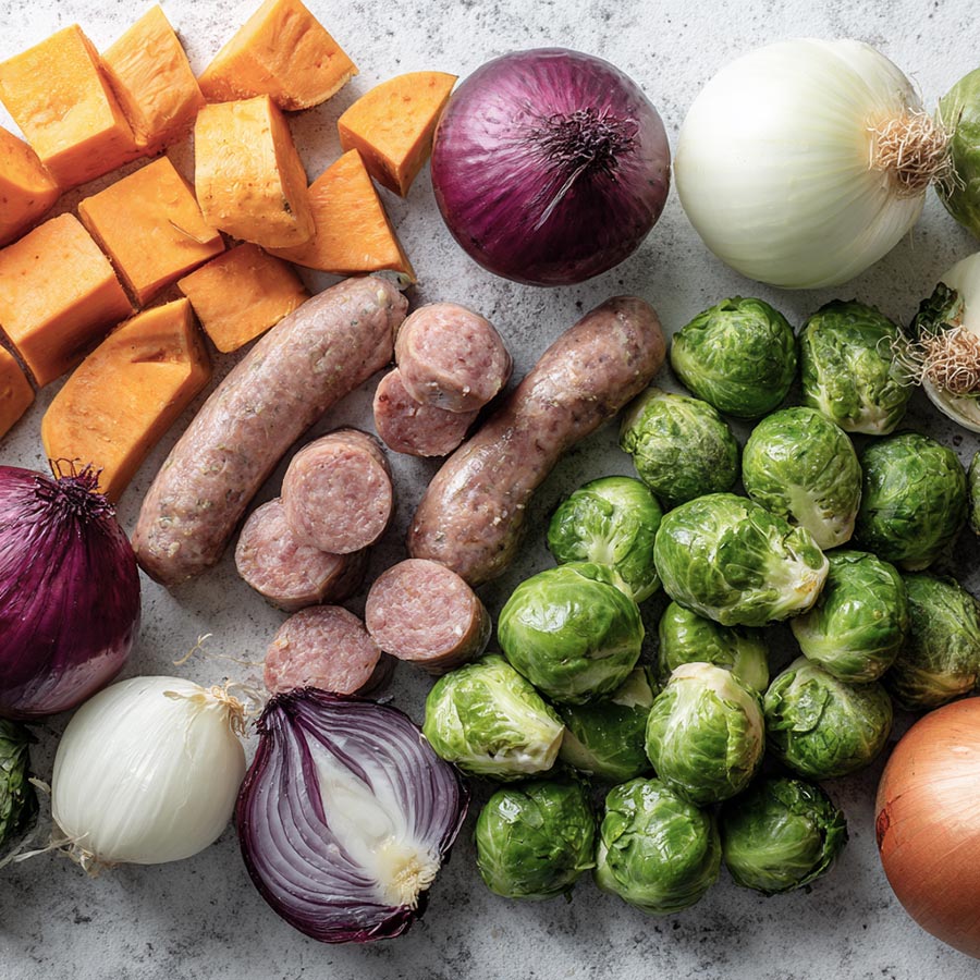 Sweet potatoes, Brussels sprouts, carrots, and red onions all roast beautifully and complement the kielbasa.