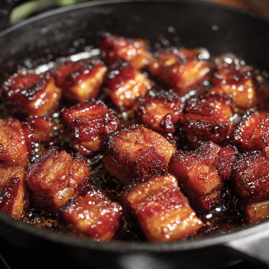 Add cooking oil to the pan and let the pork fry in its own glaze until it caramelizes.