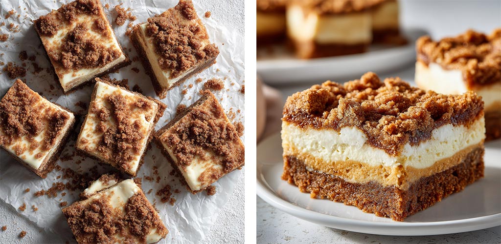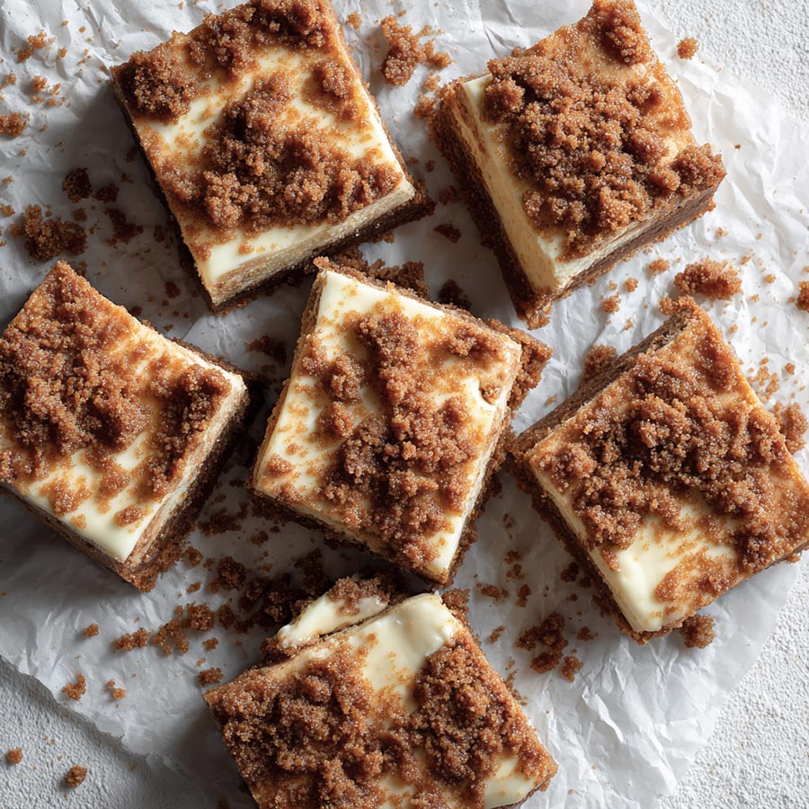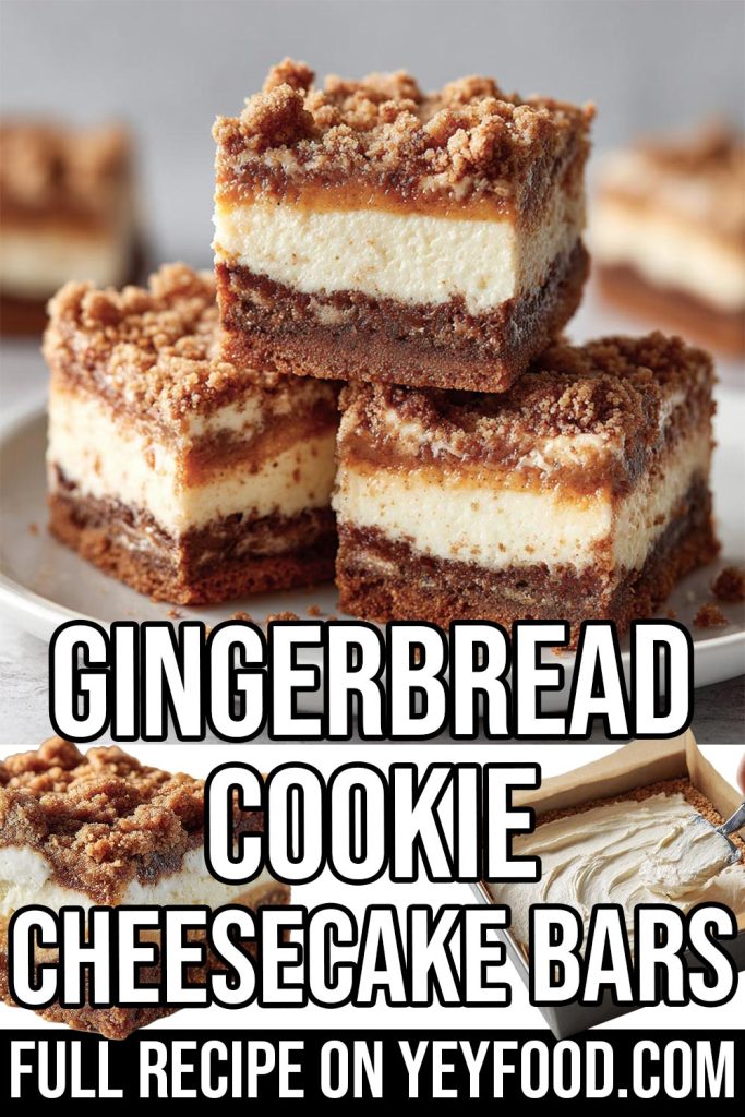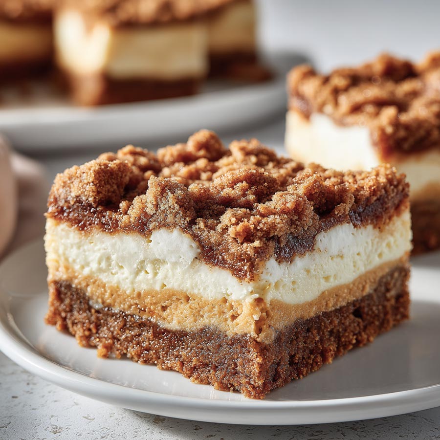 Soft gingerbread cookie bars layered with creamy cheesecake and finished with a spiced crumb topping.