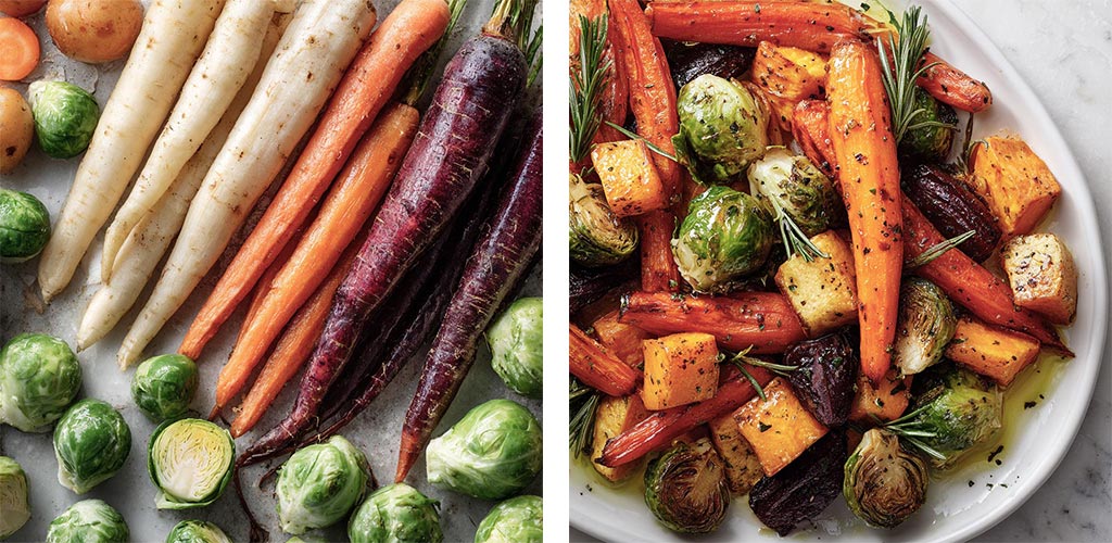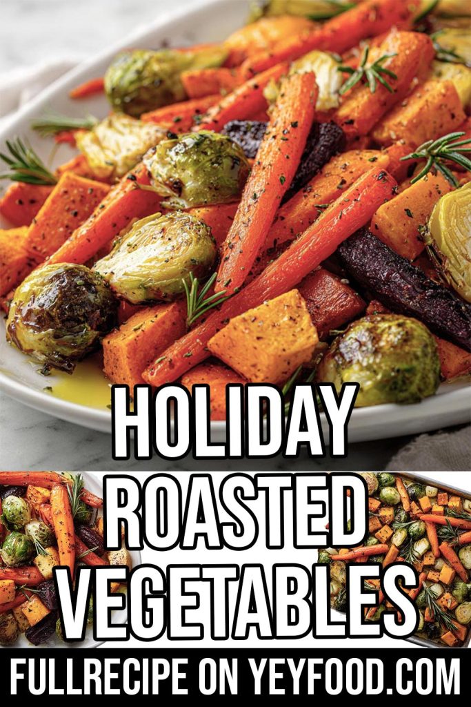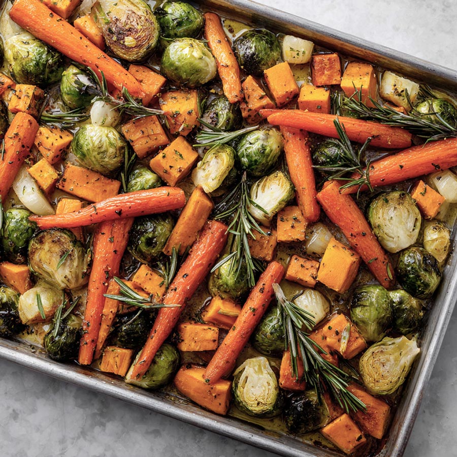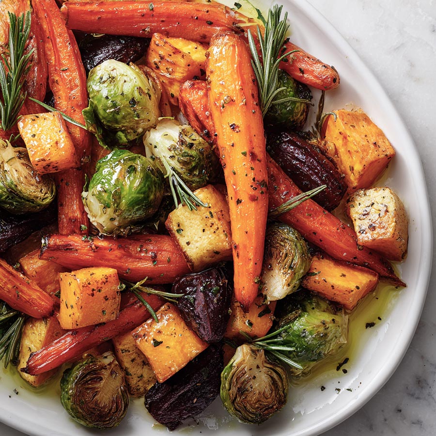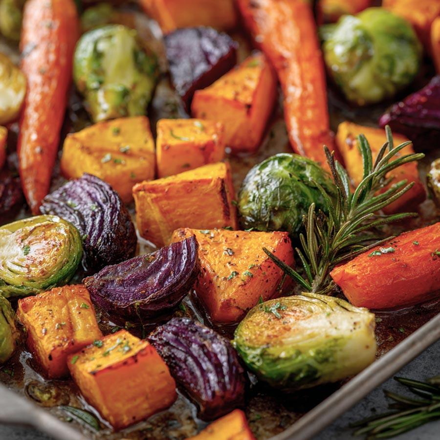 A colorful blend of seasonal vegetables roasted with olive oil, balsamic vinegar, and herbs for a simple, flavorful holiday side dish.
