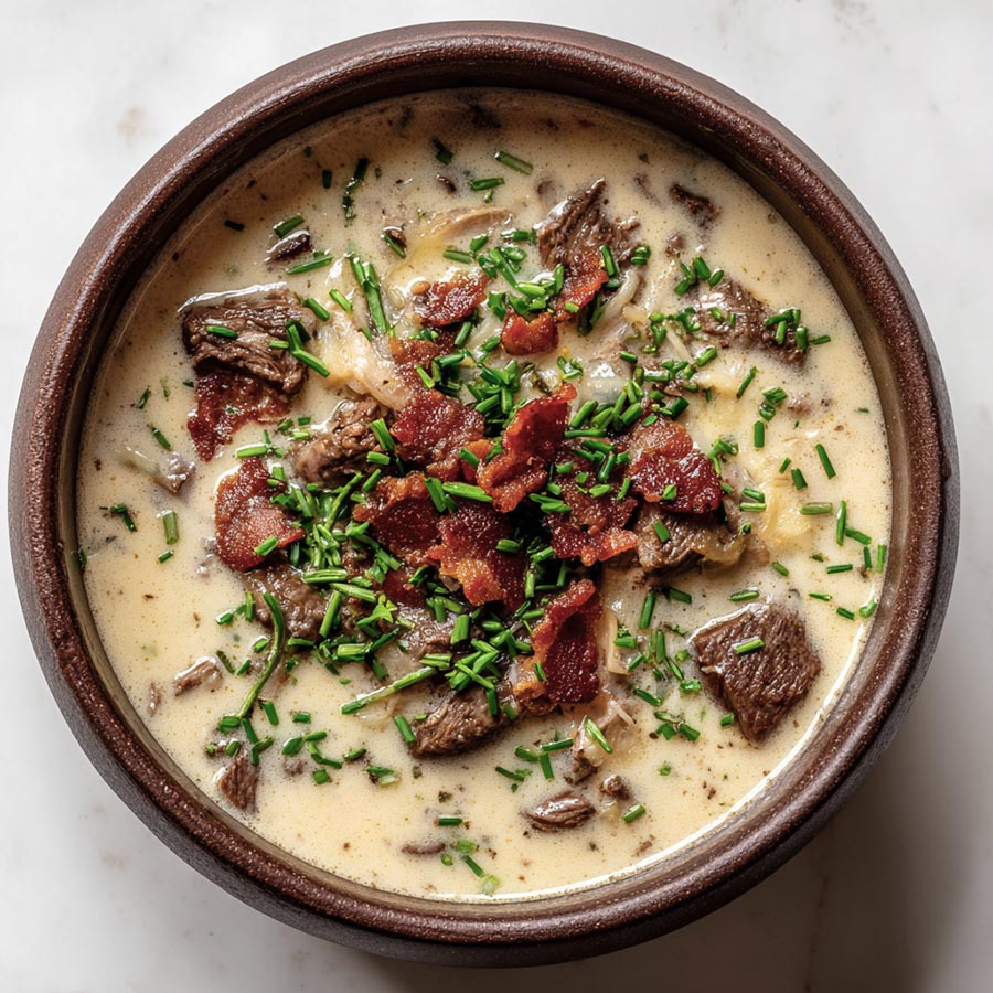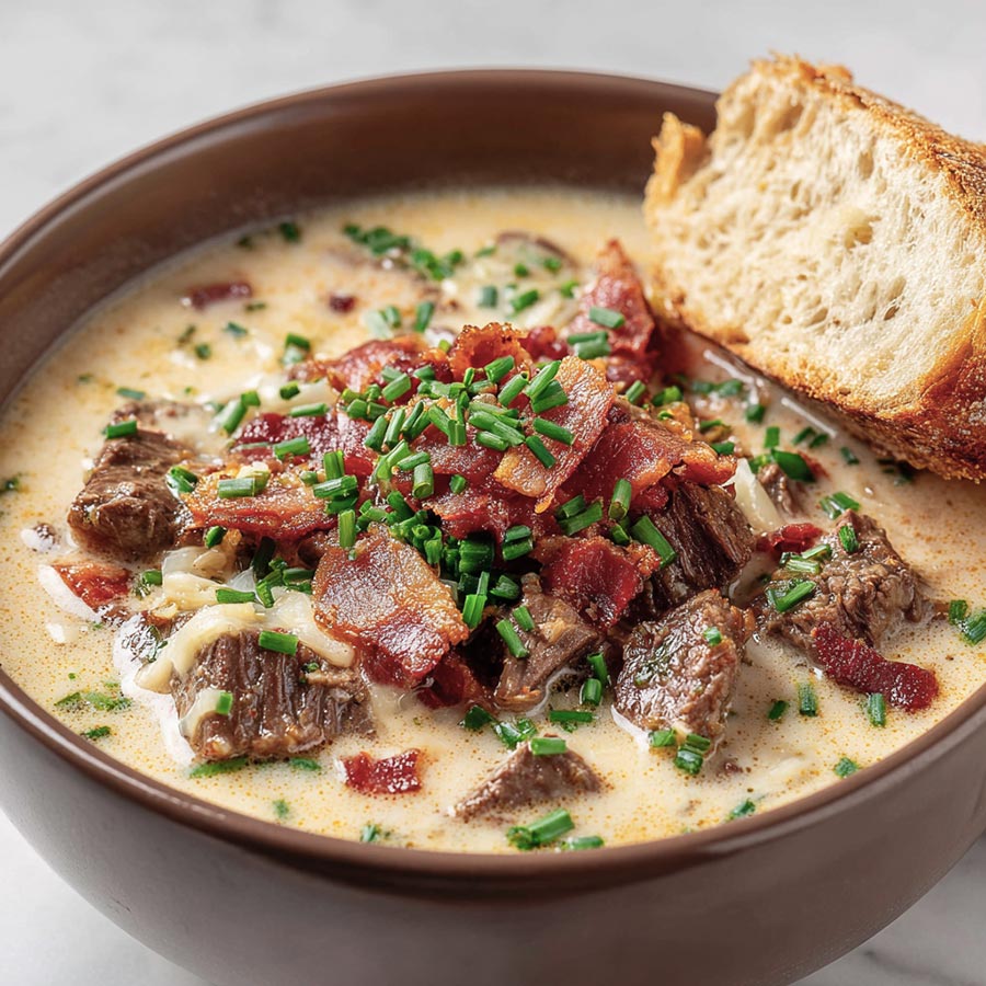 A rich and creamy soup filled with tender steak, soft peppers, and smooth cheese. Simple to prepare and perfect for a warm and steady meal.