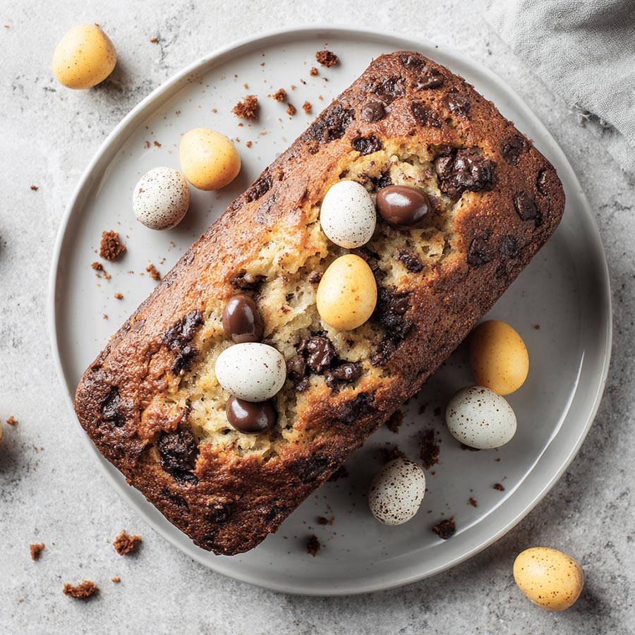 Soft banana bread filled with chopped chocolate mini eggs. A simple, comforting loaf that is easy to bake and perfect with coffee.