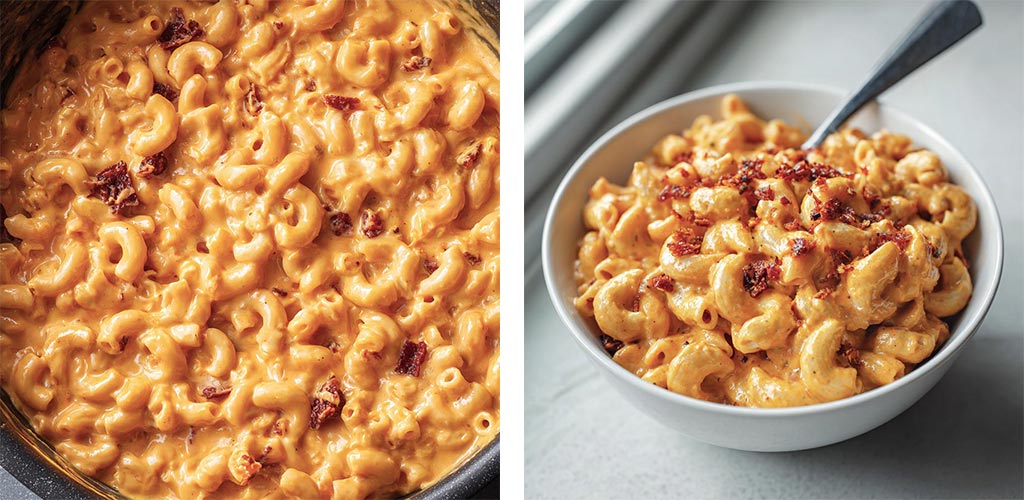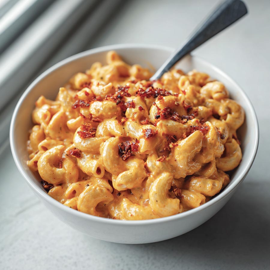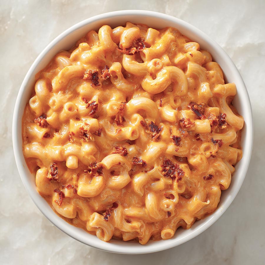 Nduja Mac and Cheese with cheddar and mozzarella. Creamy pasta with a mild spicy kick, ready in minutes.