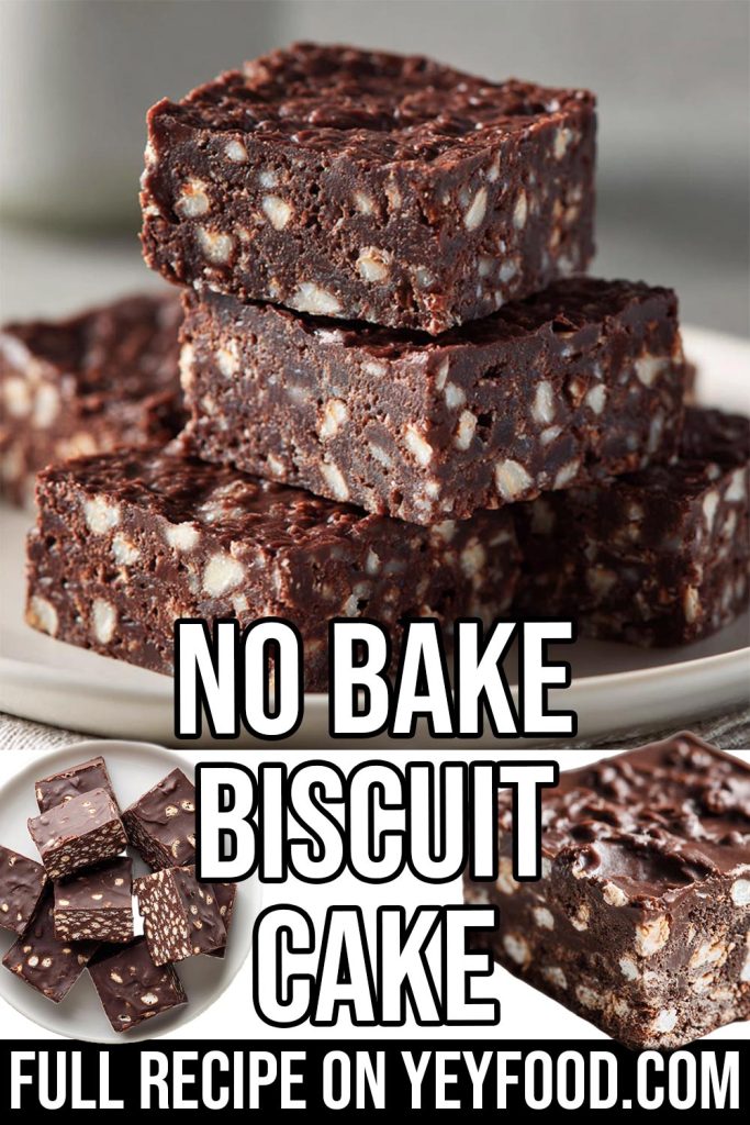 No bake biscuit cake with rich melted chocolate and soft biscuit pieces. A simple dessert that chills in the fridge and slices into neat, chocolatey squares.