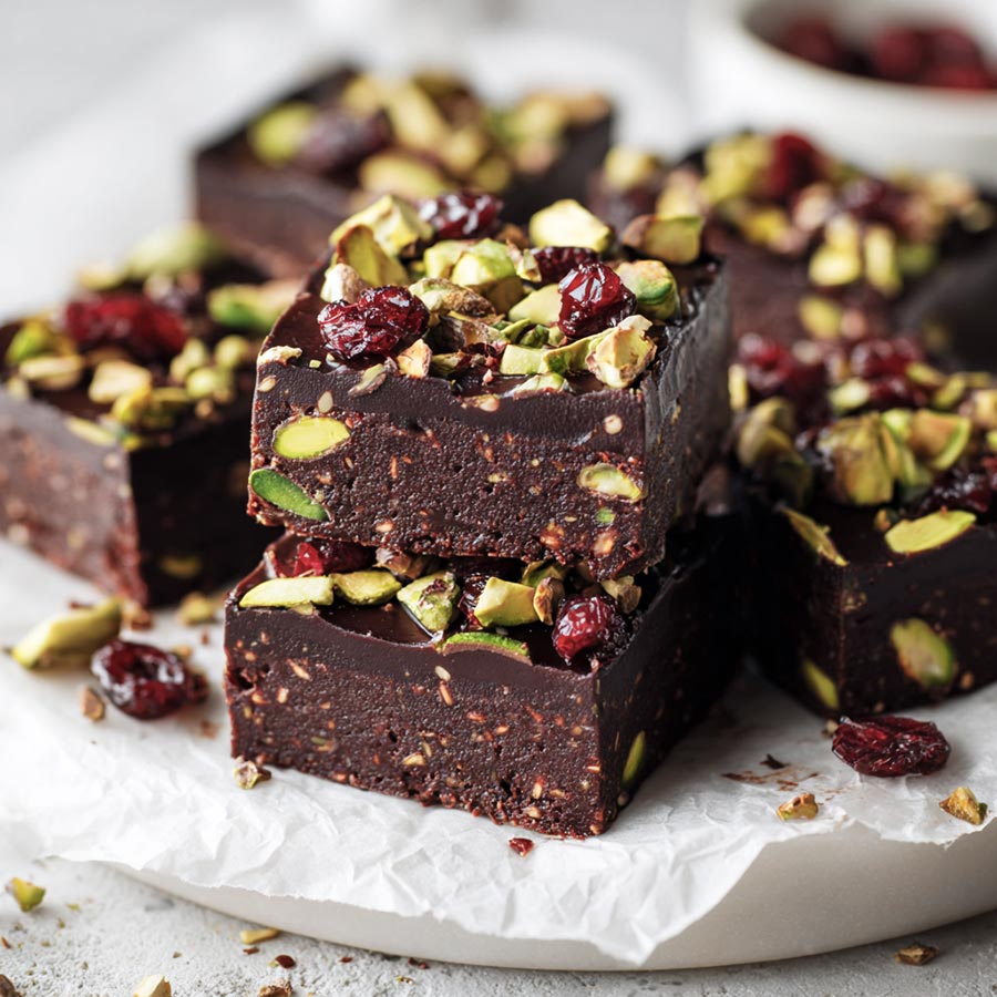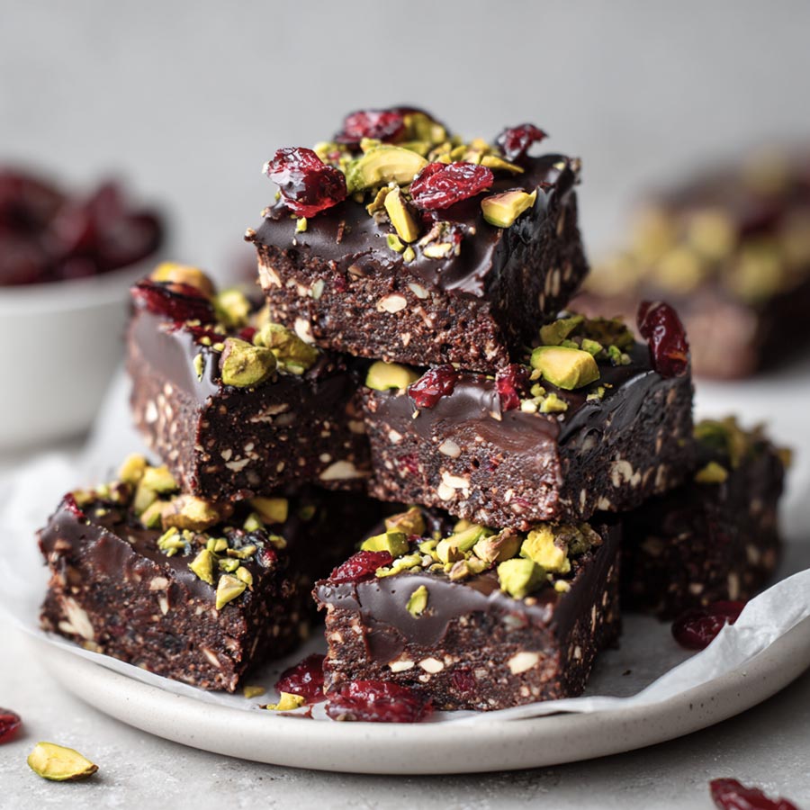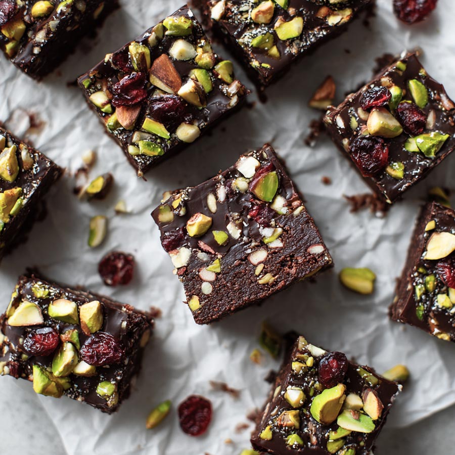 No bake superfood brownies with dark chocolate nuts and dried fruit. Easy refrigerator set dessert with balanced flavor and clean slices.