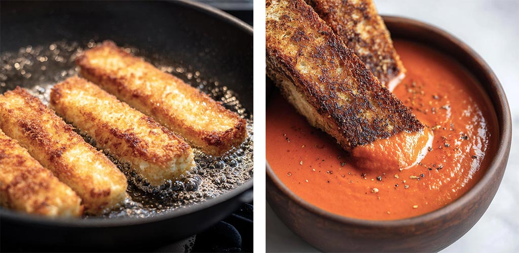 Croutons, garlic bread, or a green salad pair nicely. But honestly, the grilled cheese sticks are hard to beat.