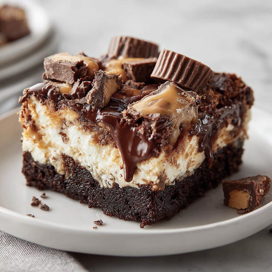 Rich chocolate cake swirled with creamy peanut butter cheesecake filling, topped with peanut butter cups and chocolate chips for the ultimate dessert.