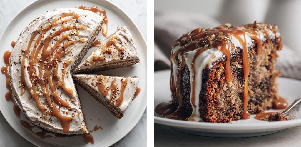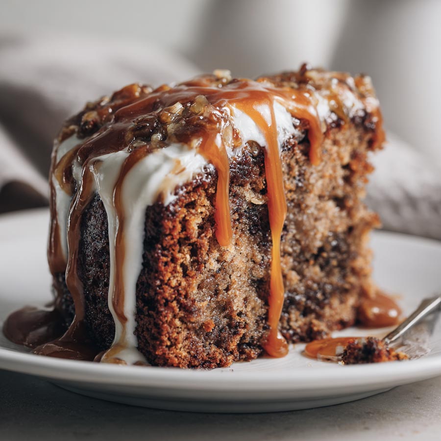 A soft chocolate banana cake topped with creamy frosting and finished with a rich salted caramel drizzle. A comforting dessert that feels special but stays simple to prepare.