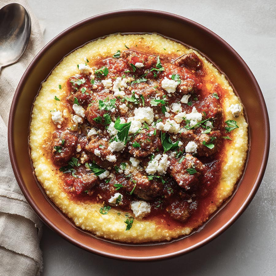Sausage ragu with creamy goat cheese polenta. A comforting, hearty meal with rich flavor and smooth texture, ready in under 40 minutes.