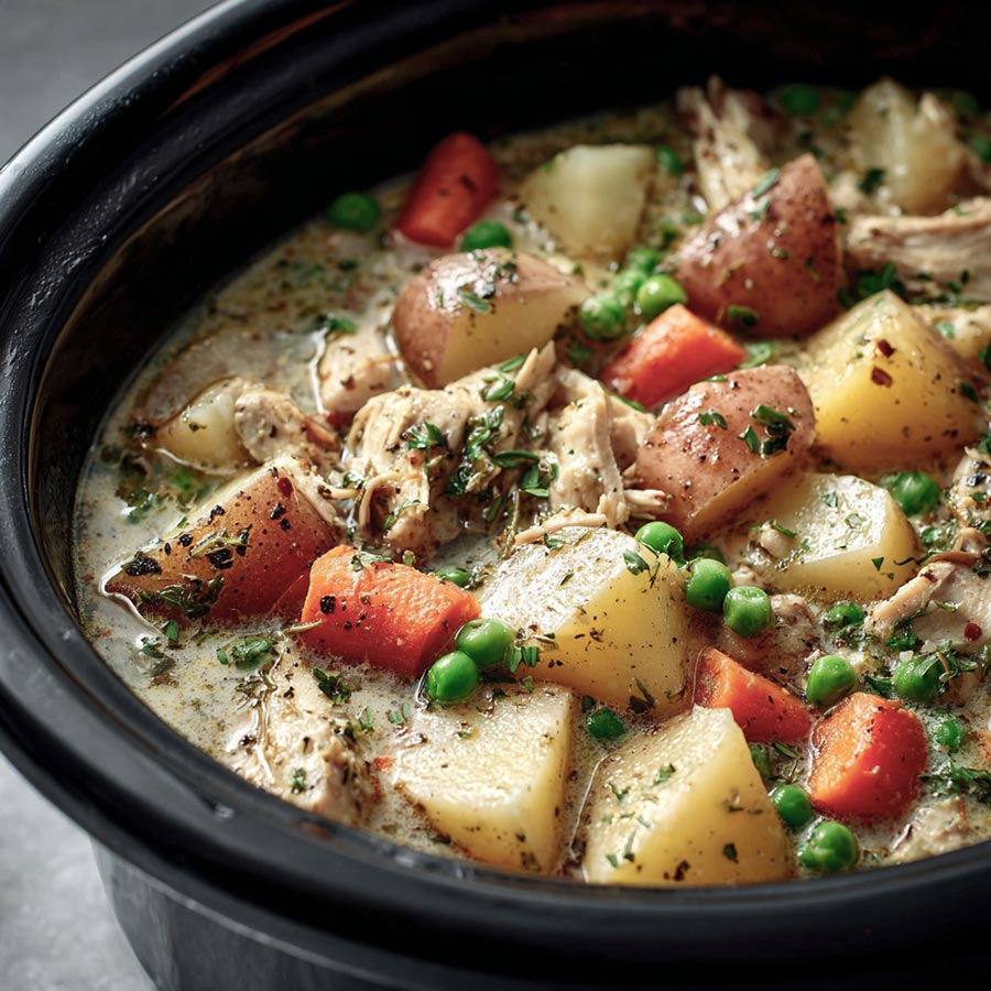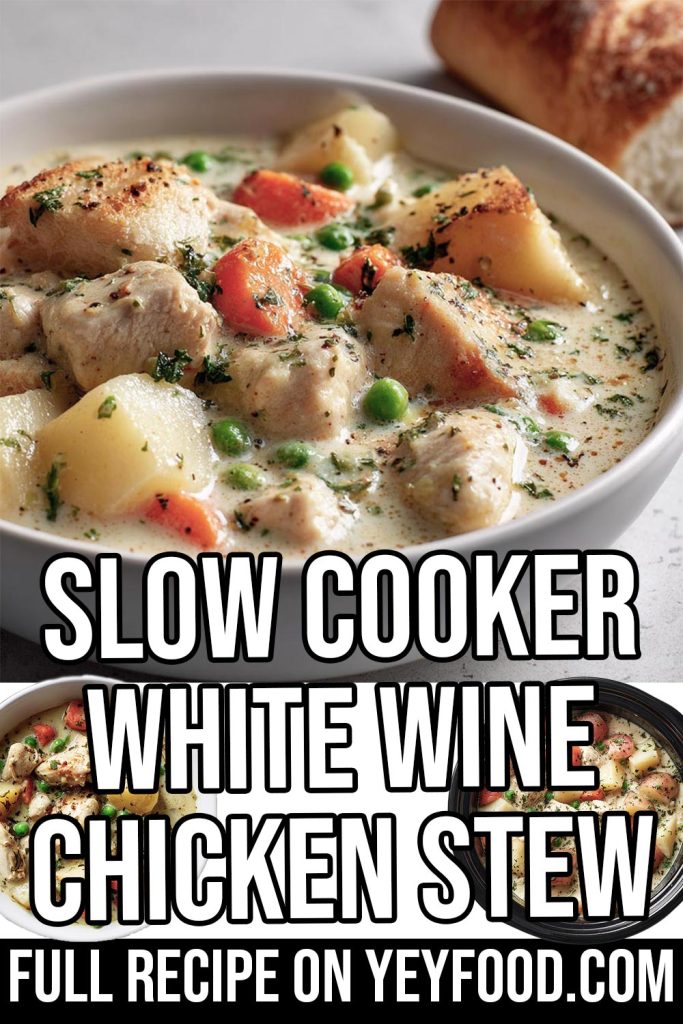 Slow cooker white wine chicken stew with tender chicken, vegetables, and a creamy broth. A hands off comfort meal made for busy days.