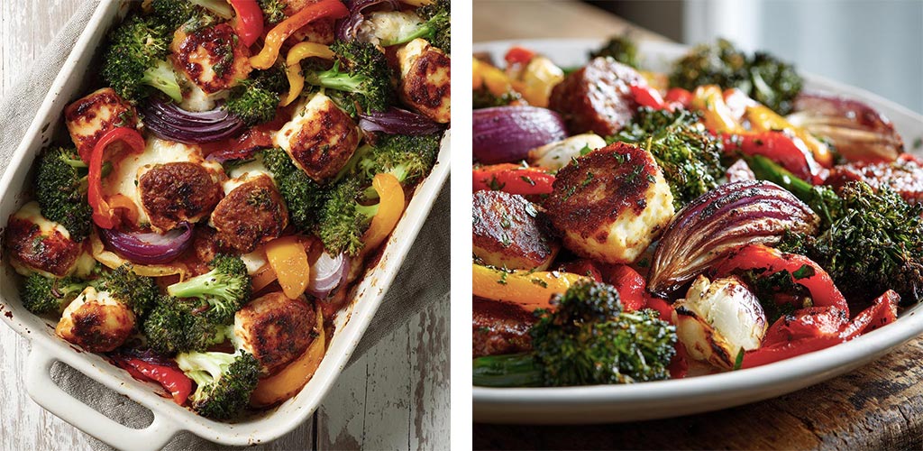 - Return to oven and roast for 15 minutes until sausages are browned and halloumi is golden.