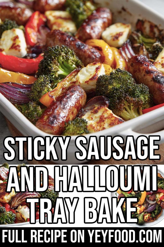 Sticky Sausage and Halloumi Traybake with roasted vegetables and sweet mustard glaze. An easy one pan dinner recipe.
