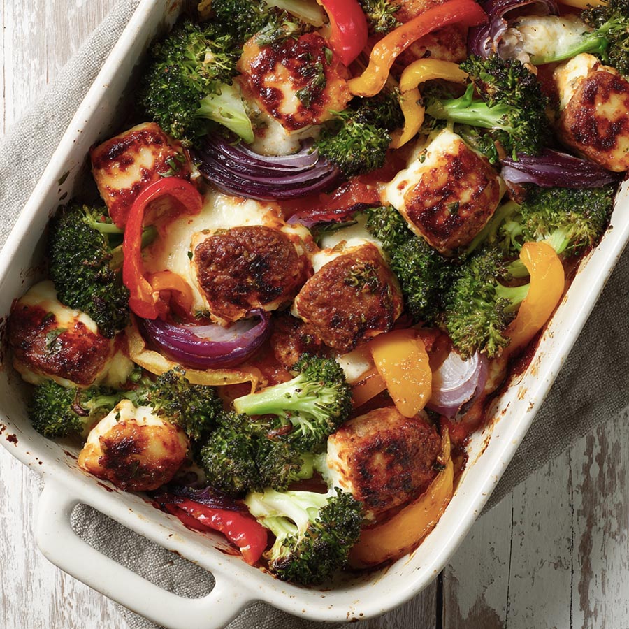 Sticky Sausage and Halloumi Traybake with roasted vegetables, golden cheese, and sweet savory glaze. A simple one pan dinner for busy evenings.