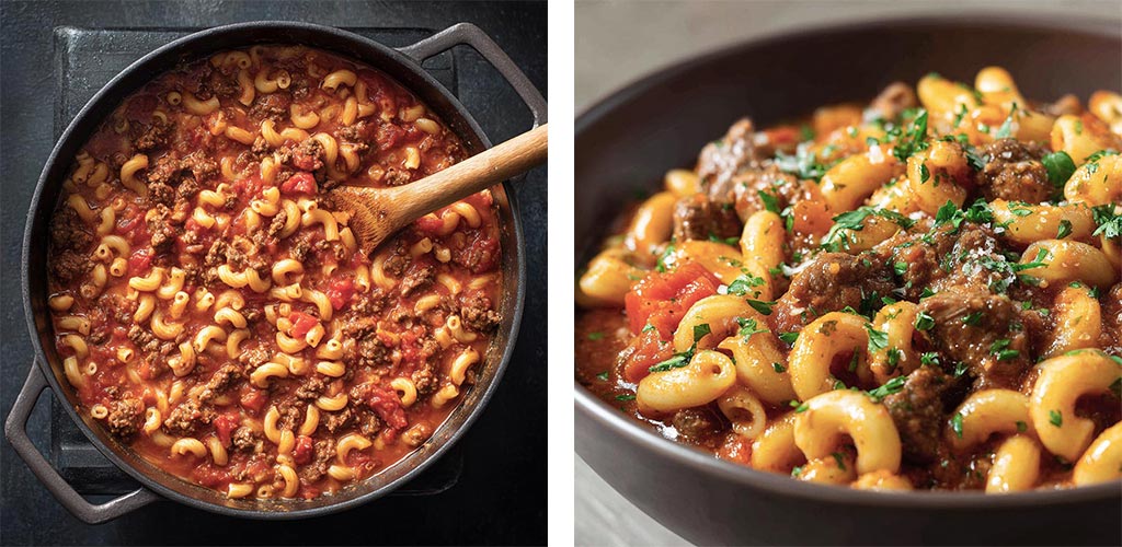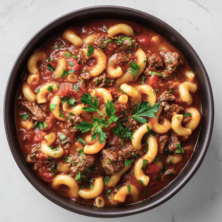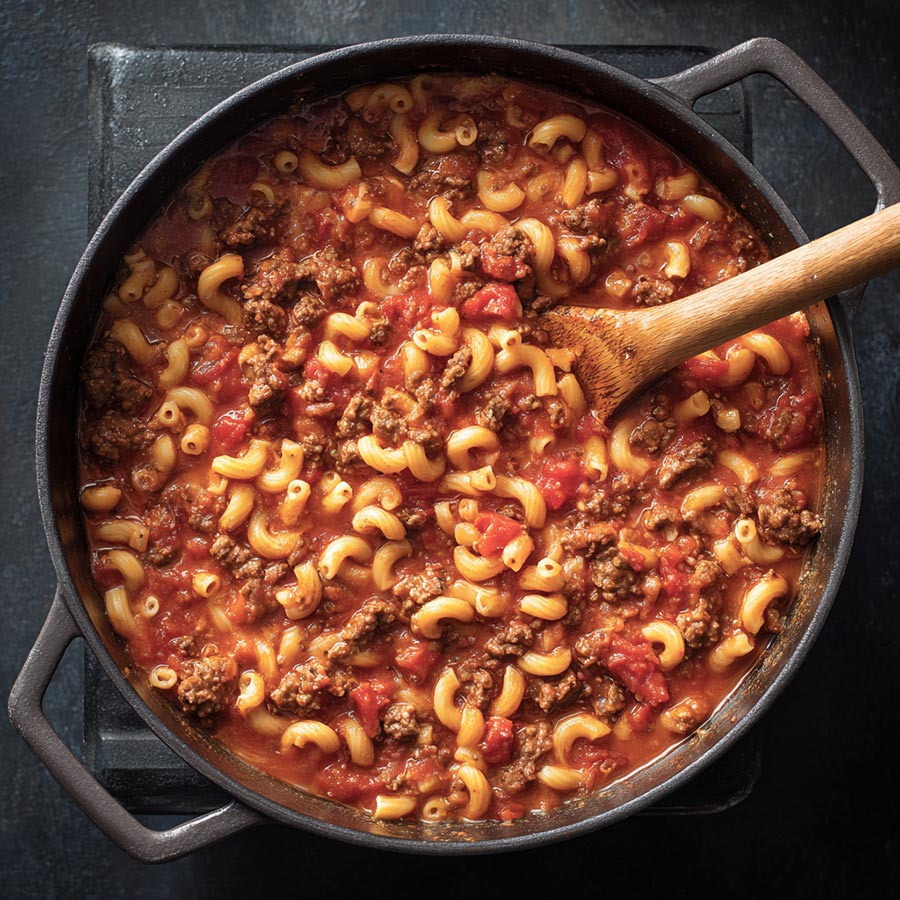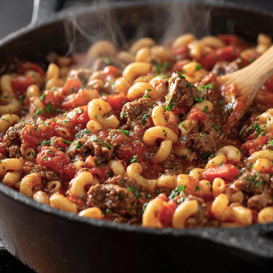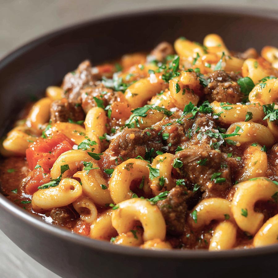 A one pot beef and pasta dish simmered in a rich tomato sauce. Hearty, easy, and full of flavor, this classic meal is perfect for family dinners.