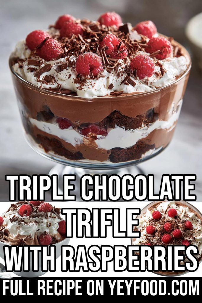 Triple chocolate trifle with raspberries recipe made with layered chocolate and fresh fruit. Easy make ahead dessert for gatherings.