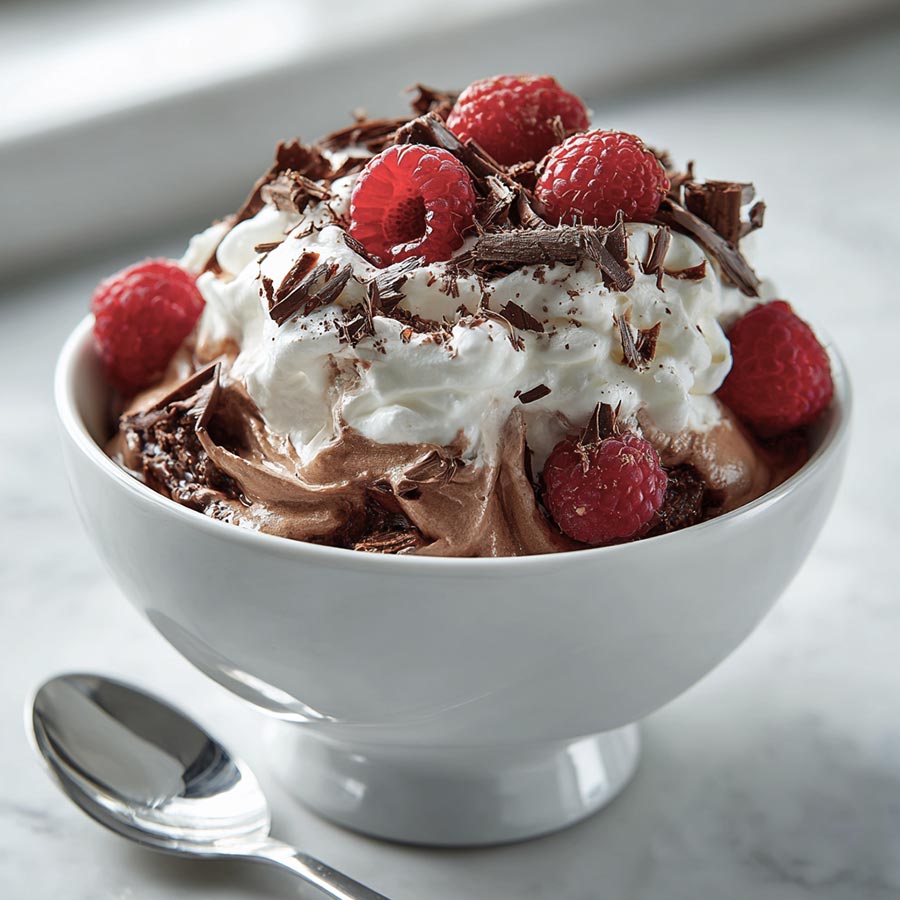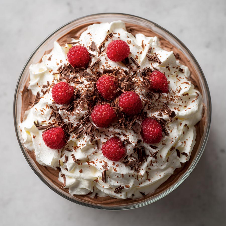 - Finish with whipped cream, raspberries, and chocolate shavings.