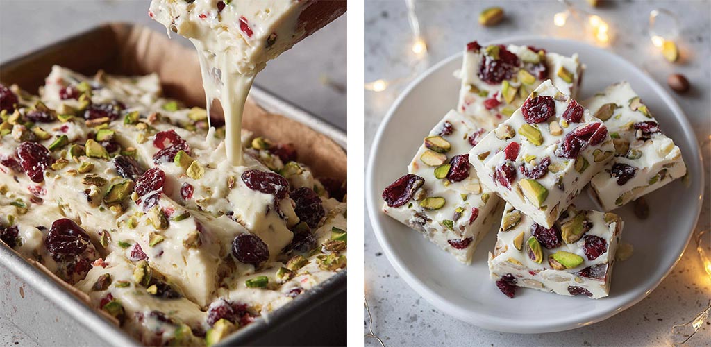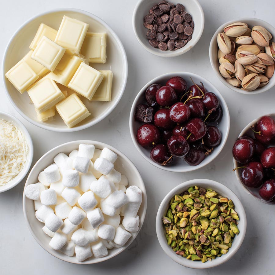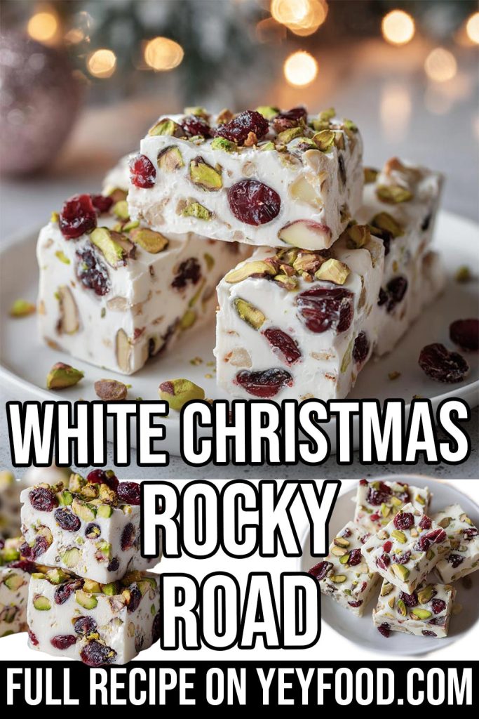 White Christmas Rocky Road recipe with white chocolate marshmallows cherries and pistachios. Easy no bake holiday dessert.